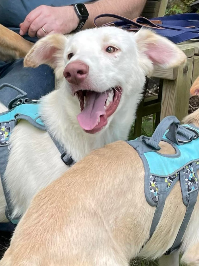 She was originally in foster with her big brother but unfortunately was left behind when he was adopted. She can be anxious around new people, especially men but is very loving. Her missing paw doesn’t hold her back at all. She is a fast runner and manages to balance when she sits to give her paw, which she loves to do.